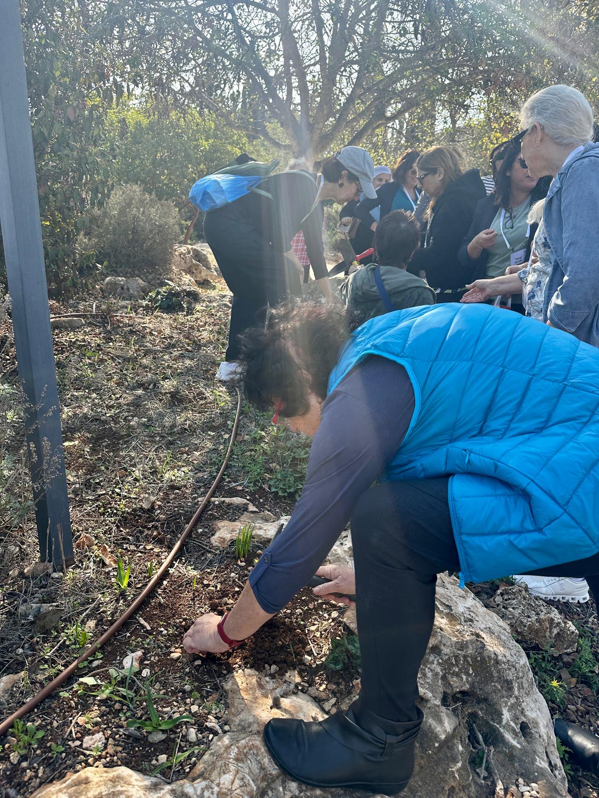 המשכנו ועברנו בגינת ביתה של איילת, בגינתה צומחים שתילי עגבניות שקיבלה מחברתנו כאותר. ומשם המשכנו אל 'הדרך של בן'. בן סלע ז"ל, יליד קורנית, נפל במלחמת לבנון השנייה. הוריו והקהילה הקימו לזכרו מיזם חי ונושם, שצמח מתוך שותפות קהילתית עמוקה. איילת סיפרה על בן, ואנחנו טמנו במקום פקעות של כלניות – מחווה של זיכרון, תקווה והמשכיות.